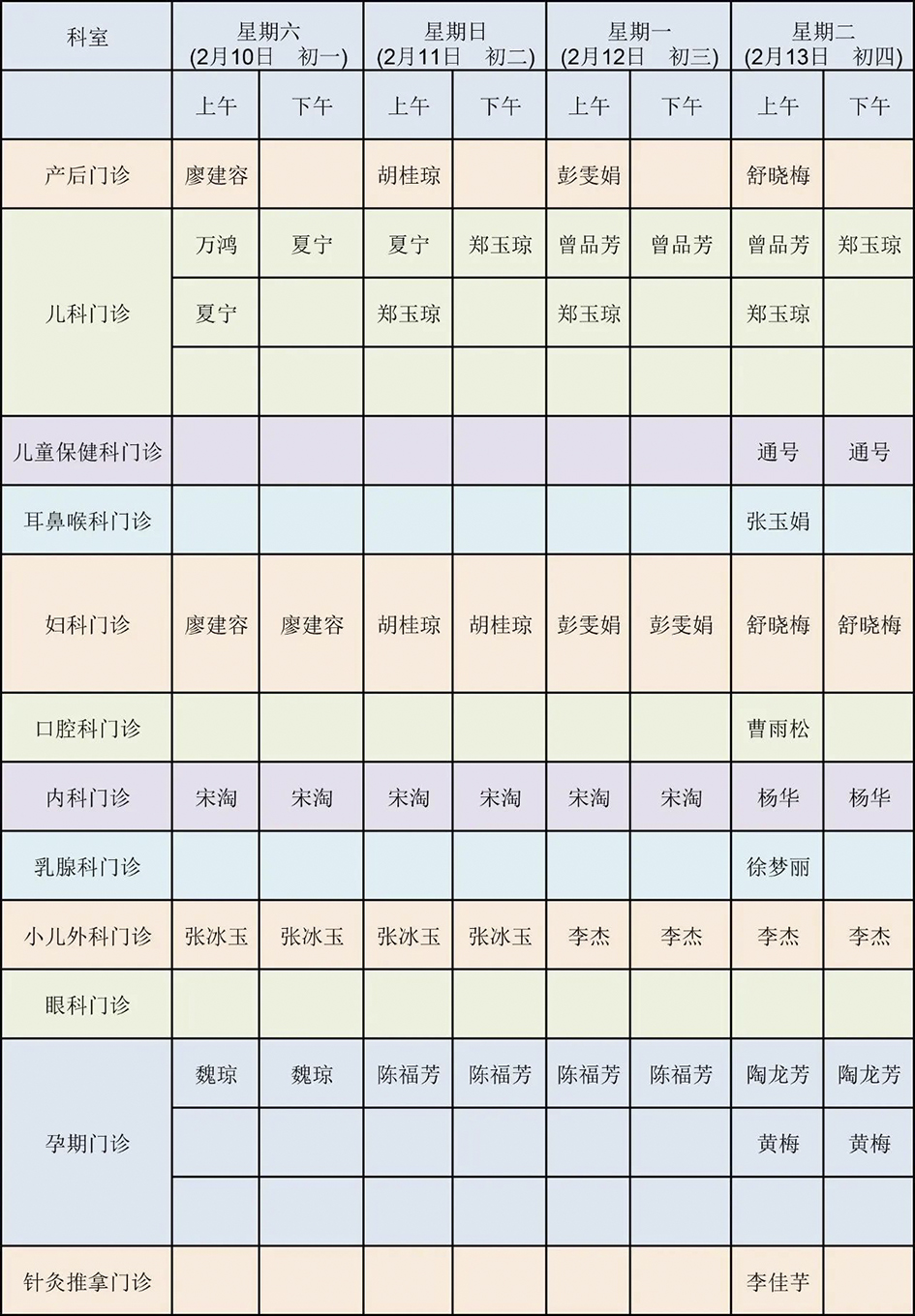 春節(jié)期間門診排班表(二)