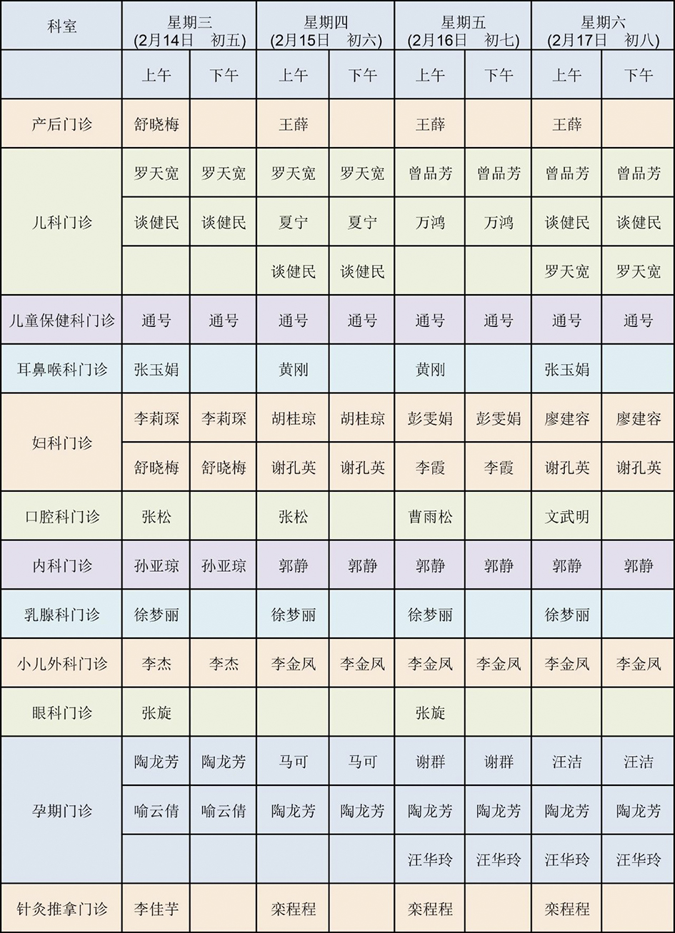 春節(jié)期間門診排班表(一)