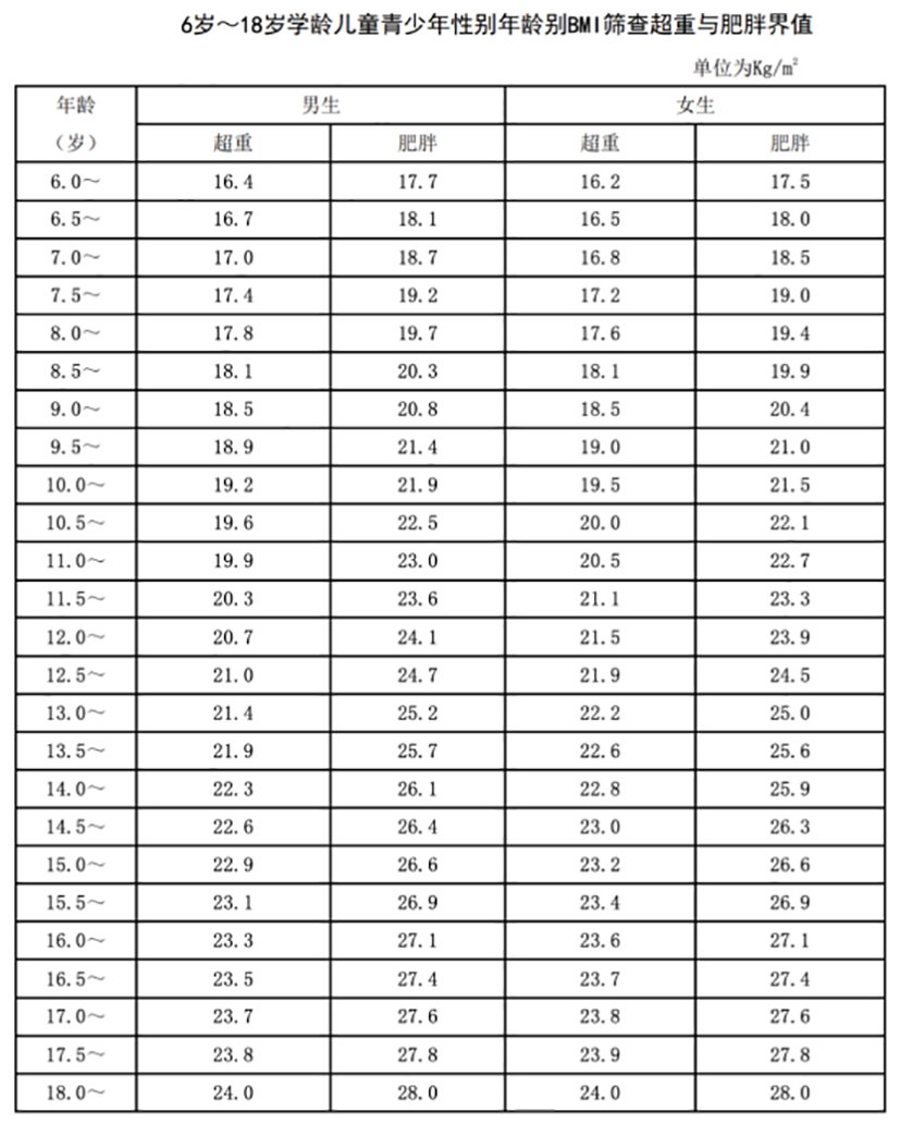 兒童肥胖評(píng)估可使用體重指數(shù)BMI初步評(píng)估,參考“兒童、青少年生長(zhǎng)曲線(xiàn)”中的超重和肥胖BMI臨界點(diǎn),體重指數(shù)BMI=體質(zhì)量(kg)/身高的平方(m2),BMI臨界點(diǎn)參考下圖: