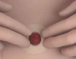 將造口袋背面的貼紙撕下,對(duì)準(zhǔn)造口自下而上粘貼。粘貼好后用手掌捂住底盤幾分鐘,這樣底盤粘貼會(huì)更穩(wěn)。