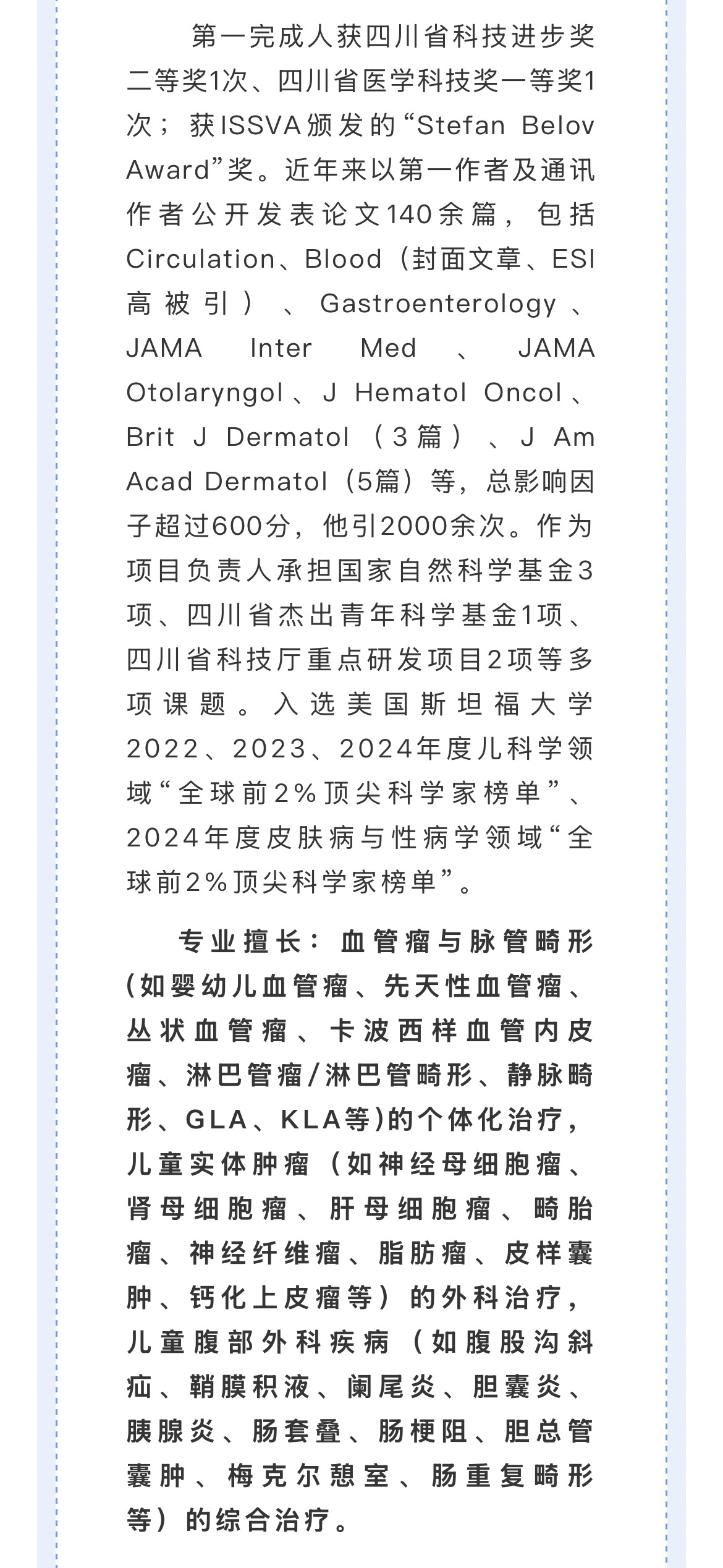 從事小兒普通外科,華西醫(yī)院兒童肝移植項目及機器人手術負責人,2017年取得(肝)移植醫(yī)師資質,組織開展兒童肝臟移植280余例。2018年取得機器人手術操作證書,完成兒童膽總管囊腫機器人手術300多臺。開展兒童膽道發(fā)育畸形、肝臟腫瘤、肝移植方面的基礎及臨床研究,成果轉化發(fā)表SCI40余篇。培養(yǎng)碩士生20余人、博士生10余人、博士后2人。