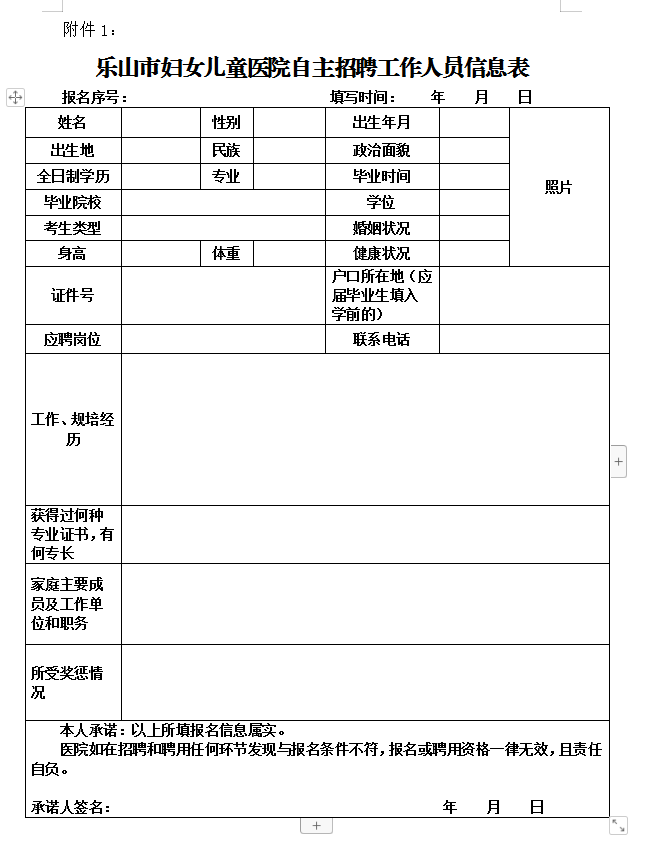 ①《樂山市婦女兒童醫(yī)院自主招聘工作人員信息表》(詳見附件1),請附本人近期免冠證件照片;