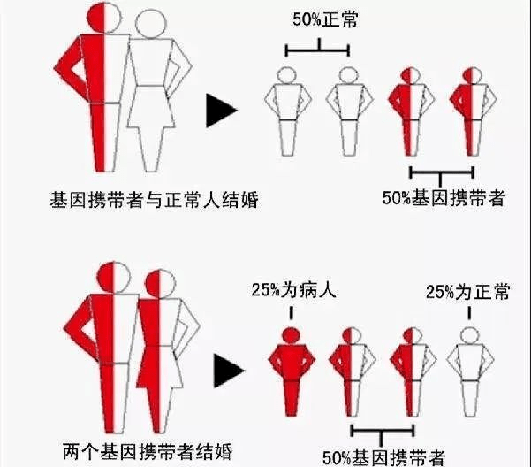 舉例來說,夫妻其中一方是地貧基因攜帶者,另一方正常,則孩子1/2幾率是正常人,1/2幾率為攜帶者。如果夫妻雙方是同一種地貧基因的攜帶者,則孩子1/4幾率是正常人,1/2幾率為攜帶者,1/4幾率為患者。