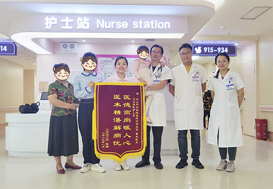 在我院兒科經(jīng)過抗病毒、降顱壓、營養(yǎng)支持等綜合治療后,小晞的病情很快便得到控制。為預(yù)防出現(xiàn)智力障礙、運動障礙等后遺癥,科室還有針對性地為孩子進(jìn)行智力訓(xùn)練、康復(fù)運動等后期康復(fù)治療。經(jīng)過一個多星期的治療,小晞終于好轉(zhuǎn)出院。為表達(dá)對醫(yī)護(hù)人員的感激之情,小晞的父母便特意制作了一面錦旗表示感謝。